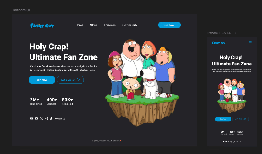 This project is a fan centred web design concept inspired by the Family Guy animated series. The goal was to create an engaging, vibrant, and user-friendly website where fans can connect, watch episodes, shop Family Guy items, and interact with the global Family Guy community.