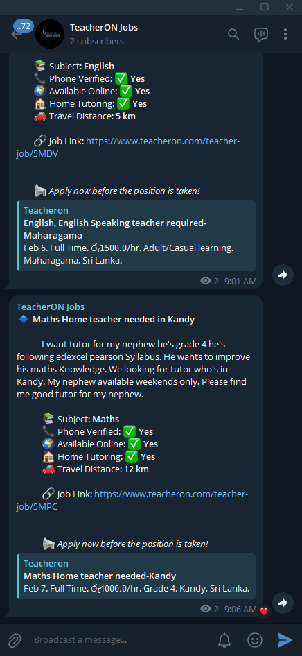 The automated bot forwards new teaching positions right when students/parents post them on websites. A simple channel brings job updates to you without searches on site. 🚀
